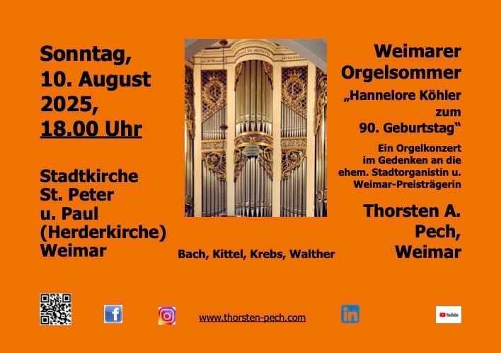 Mit einem Gedenkkonzert innerhalb des Weimarer Orgelsommers erinnert Thorsten A. Pech am Sonntag, 10. August um 18 Uhr in der Stadtkirche St. Peter und Paul (Herderkirche) an das Wirken der ehem. Stadtorganistin und Weimar-Preisträgerin KMD Hannelore Köhler (1935-2014), die in diesen August-Tagen ihren 90. Geburtstag hätte feiern können. Mit den von ihr besonders geschätzten und geliebten Komponisten J.S.Bach, D. Buxtehude und natürlich J.G.Walther, der ebenfalls - zu Bachs Zeiten - in Weimar Stadtorganist war, gestaltet der inzwischen in Weimar lebende Thorsten Pech und mit Hannelore Köhler lange Jahre persönlich sehr verbunden und im kollegialen Austausch stand dieses Sommerkonzert mit einer herzlichen Einladung an alle, die es einrichten können, daran teilzunehmen.